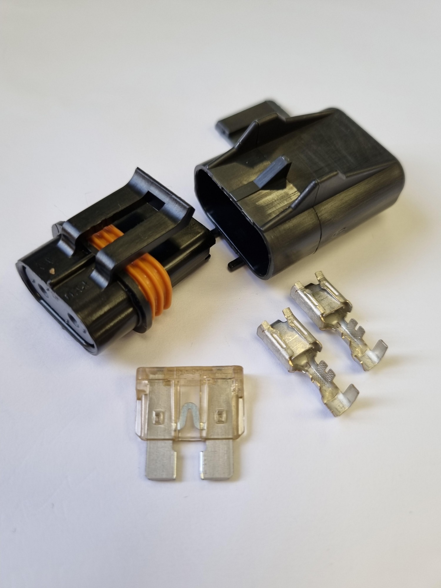 Delphi Waterproof Blade Fuse Holder Kit. Includes 2 Way Black/Grey Plug Housing, 2 Female Terminals, 1 Fuse Cover, 1 Fuse (please selct below).