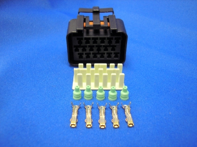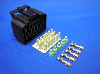 Econoseal waterproof female 18 way connector (for use with wire-to-board male), supplied with anti-backout, 18 terminals and wire seals plus 4 cavity plugs for unused positions.
