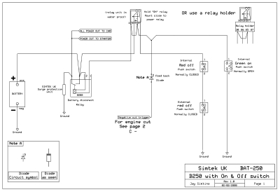This kit allows the user to remotely switch battery power on and off using a simple push button switch system. Two red battery off switches are located inside and outside the vehicle cabin and one green push button switch is located inside the vehicle cabin to switch battery power on. A perfect safety edition to your vehicle to avoid rusting pull cables, MSA/FIA legal with schematic wiring diagram provided.
